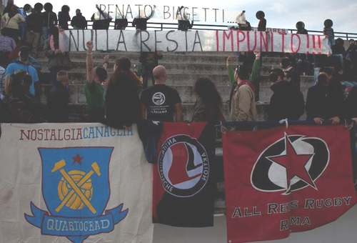 (..) Il secondo tempo è cominciato con uno striscione mostrato dagli spalti che recitava: "Renato Biagetti - Nulla resterà impunito", lo striscione esposto dai ragazzi che occupavano la gradinata è per ricordare, il compagno Romano, accoltellato a sangue freddo da due fascistelli all'uscita di una Dance Hall sulla spiaggia a Focene, vicino Roma all'età di 26 anni il 29 Agosto 2006. I Compagni e le Compagne non dimenticano.